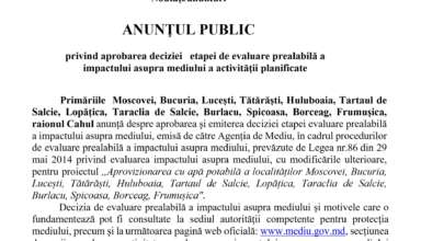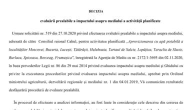 Economic Decizia evaluării prealabile a impactului asupra mediului, emisă de către Agenția de Mediu pentru proiectul ,,Aprovizionarea cu apă potabilă a localităților Moscovei, Bucuria, Lucești, Tătărăști, Huluboaia, Tartaul de Salcie, Lopățica, Taraclia de Salcie, Burlacu, Spicoasa, Borceag, Frumușica”