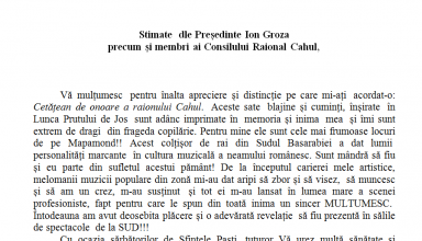 Noutăți Mesajul de multumire a Doamnei Maria Sarabas, Artista a poporului din RM pentru Ion Groza, Presedinele Raionului Cahul
