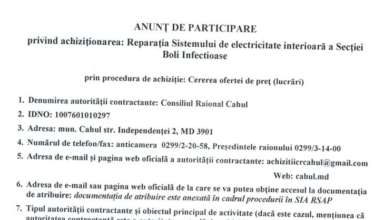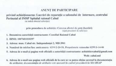 Achiziții publice Anunț de participare privind achiziționarea lucrărilor de reparație a salonului de internare, Centrului Perinatal al IMSP Spitalul Raional Cahul
