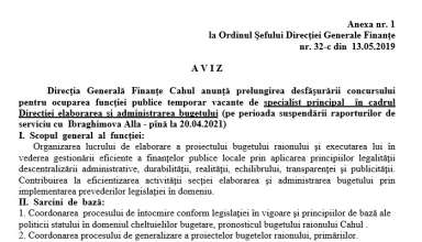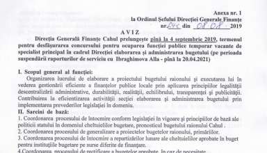 Anunțuri ANUNȚ cu privire la prelungirea termenului de desfășurare a concursului pentru ocuparea funcției publice temporar vacante de specialist principal în cadrul Direcției elaborarea și administrarea bugetului