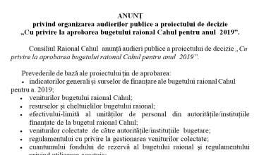 Anunțuri ANUNŢ privind organizarea audierilor publice a proiectului de decizie„Cu privire la aprobarea bugetului raional Cahul pentru anul 2019”.