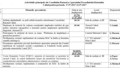Noutăți Activităţile principale ale Consiliului Raional şi Aparatului Preşedintelui RaionuluiCahul pentru perioada 17.07.2017-21.07.2017