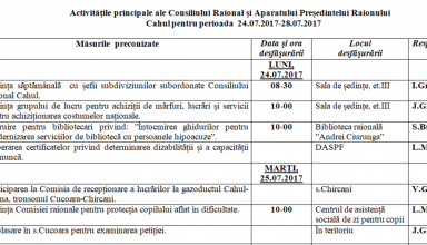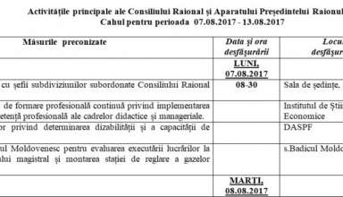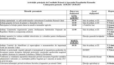 Noutăți Activităţile principale ale Consiliului Raional şi Aparatului Preşedintelui Raionului Cahul pentru perioada 07.08.2017 – 13.08.2017