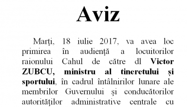 Noutăți Activităţile principale ale Consiliului Raional şi Aparatului Preşedintelui Raionului Cahul pentru perioada 03.07.2017-07.07.2017
