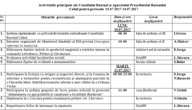Noutăți Activităţile principale ale Consiliului Raional şi Aparatului Preşedintelui Raionului Cahul pentru perioada 10.07.2017-14.07.2017