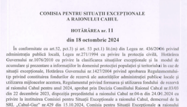 Noutăți Hotărârea nr.11 din 18 octombrie 2024 a Comisiei pentru Situații Excepționale a raionului Cahul