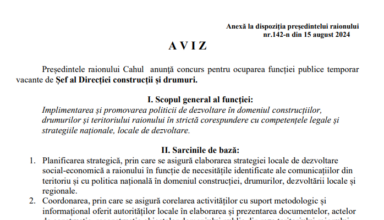 Anunțuri Președintele raionului Cahul anunţă concurs pentru ocuparea funcției publice temporar vacante de Șef al Direcției construcții și drumuri