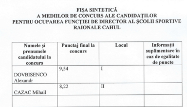 Noutăți REZULTATELE concursului pentru ocuparea funcției de director al Școlii Sportive Raionale Cahul