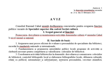 Anunțuri Consiliul Raional Cahul anunţă desfăşurarea concursului pentru ocuparea funcţiei publice vacante de Specialist superior din cadrul Secției cultură