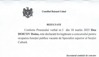 Anunțuri Rezultatele concursului pentru ocuparea funcției publice vacante de Specialist superior al Secției Cultură.