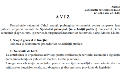 Posturi vacante ANUNȚ: privind desfășurarea concursului pentru ocuparea funcției publice vacante de șef al Secției contabilitate din cadrul Aparatului Președintelui Raionului Cahul