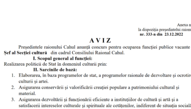 Posturi vacante ANUNȚ: Consiliul Raional Cahul anunță concurs pentru ocuparea funcției publice vacante de specialist superior al Secției Cultură.