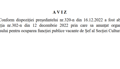 Noutăți ANUNȚ: Lista candidaților admiși la proba scrisă pentru ocuparea funcției publice vacante de șef al Secției cultură